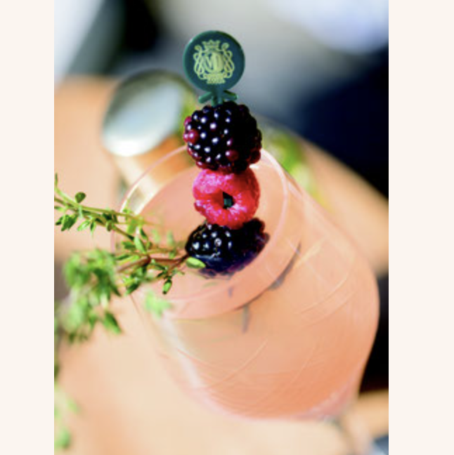 Brombeeren, Himbeeren und Thymian für die Deko, alles verrühren und im Weinglas servieren.